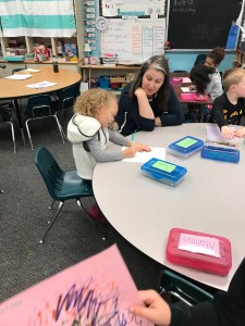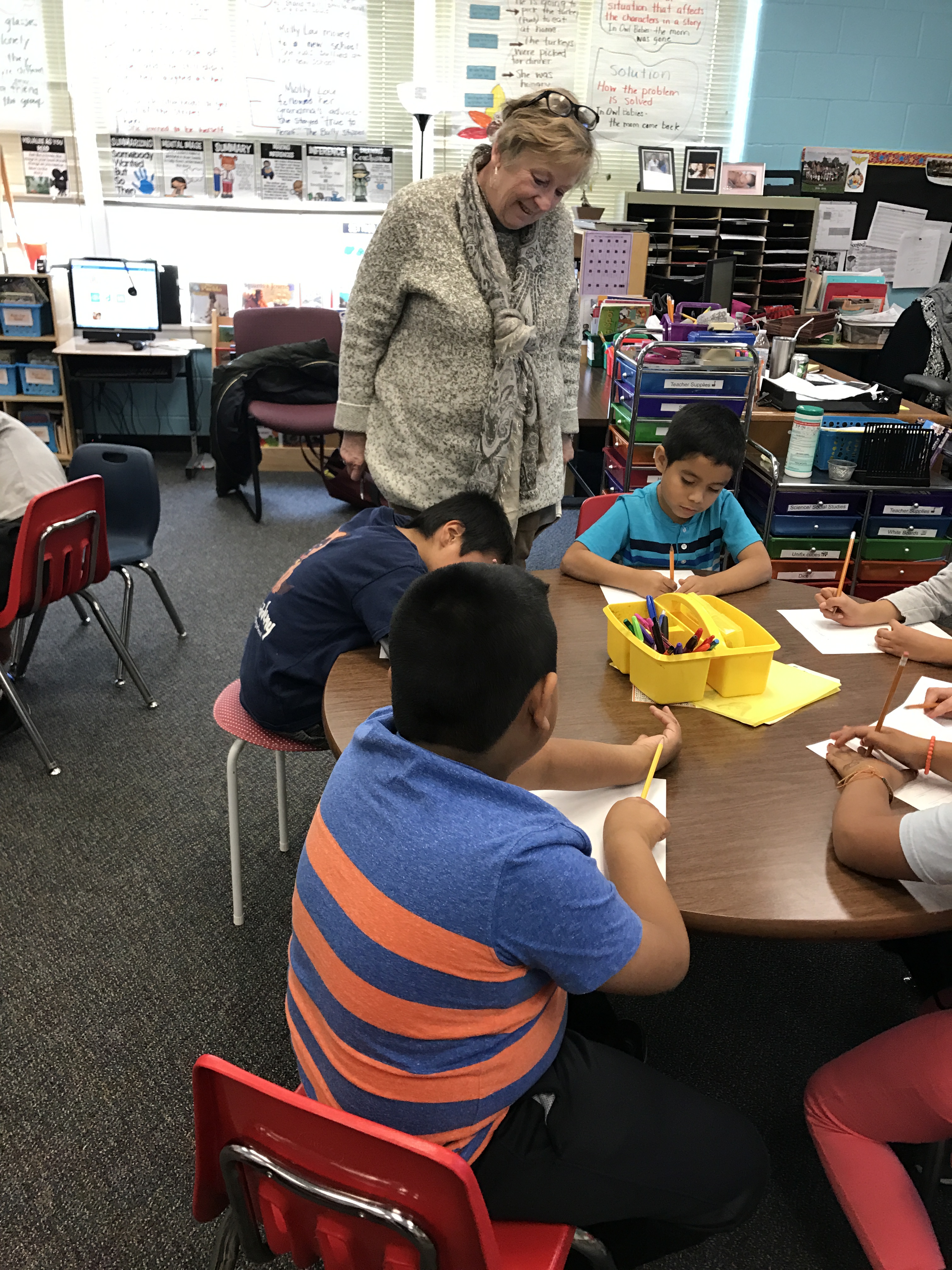 A visitor (below left) chats with a writer. Kimberly Peterson, current SVWP Teacher Consultant (pictured at right), visits with more writers at Quarles.
